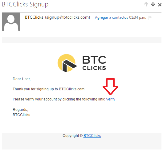 4. Debes revisar tu correo y buscar el mensaje de verificación que es similar a la siguiente imagen y hacer click en el Link Verify como lo indica en la siguiente Imagen.