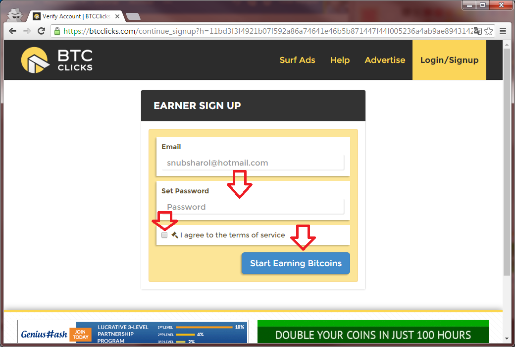5. Por ultimo serás enviado a una web donde escribirás la clave que quieren que tenga tu cuenta de BTCClick y Aceptaras los términos de uso y presionaras el botón “Start Earning Bitcoin” como lo indica en la siguiente imagen.