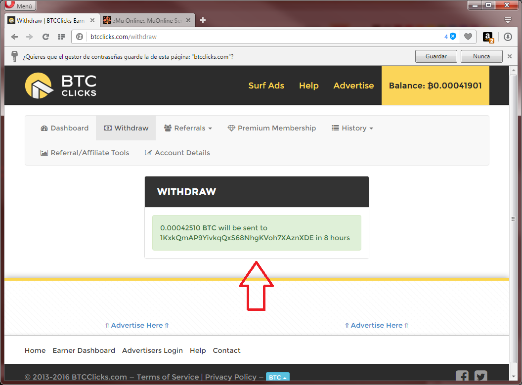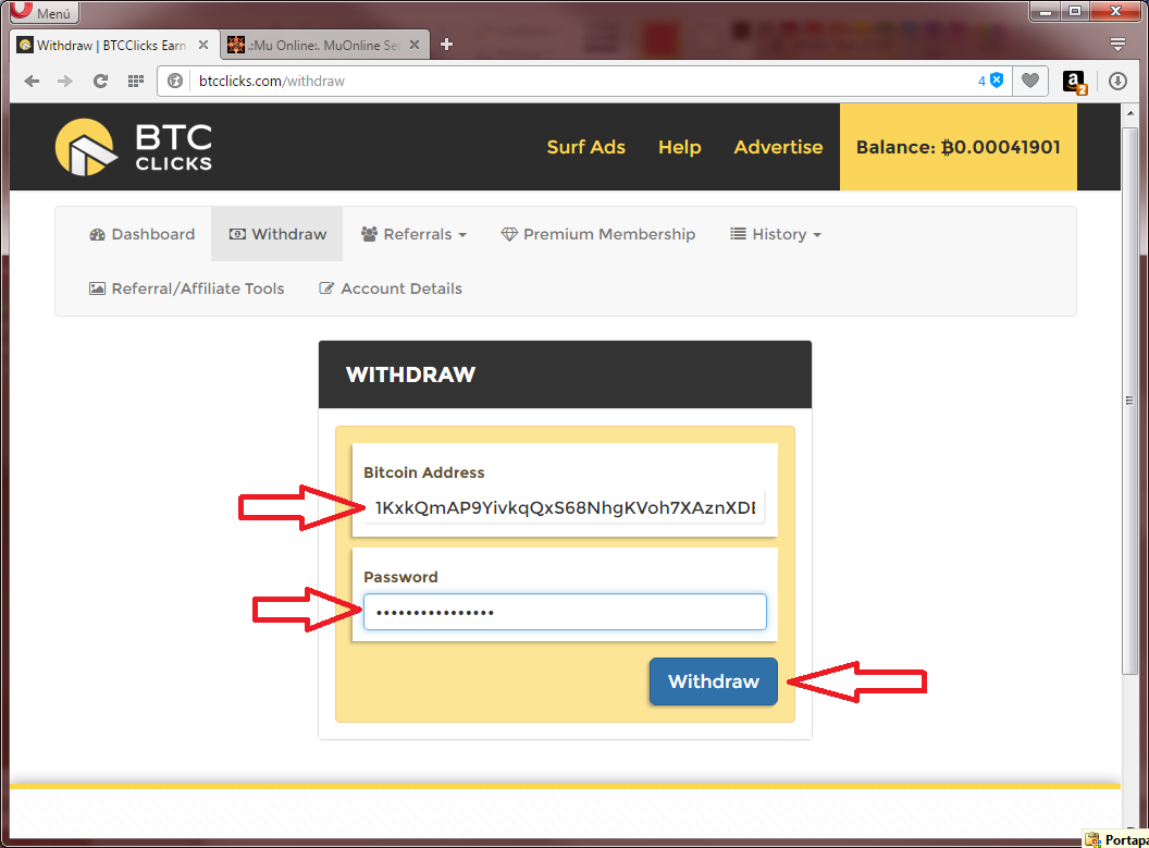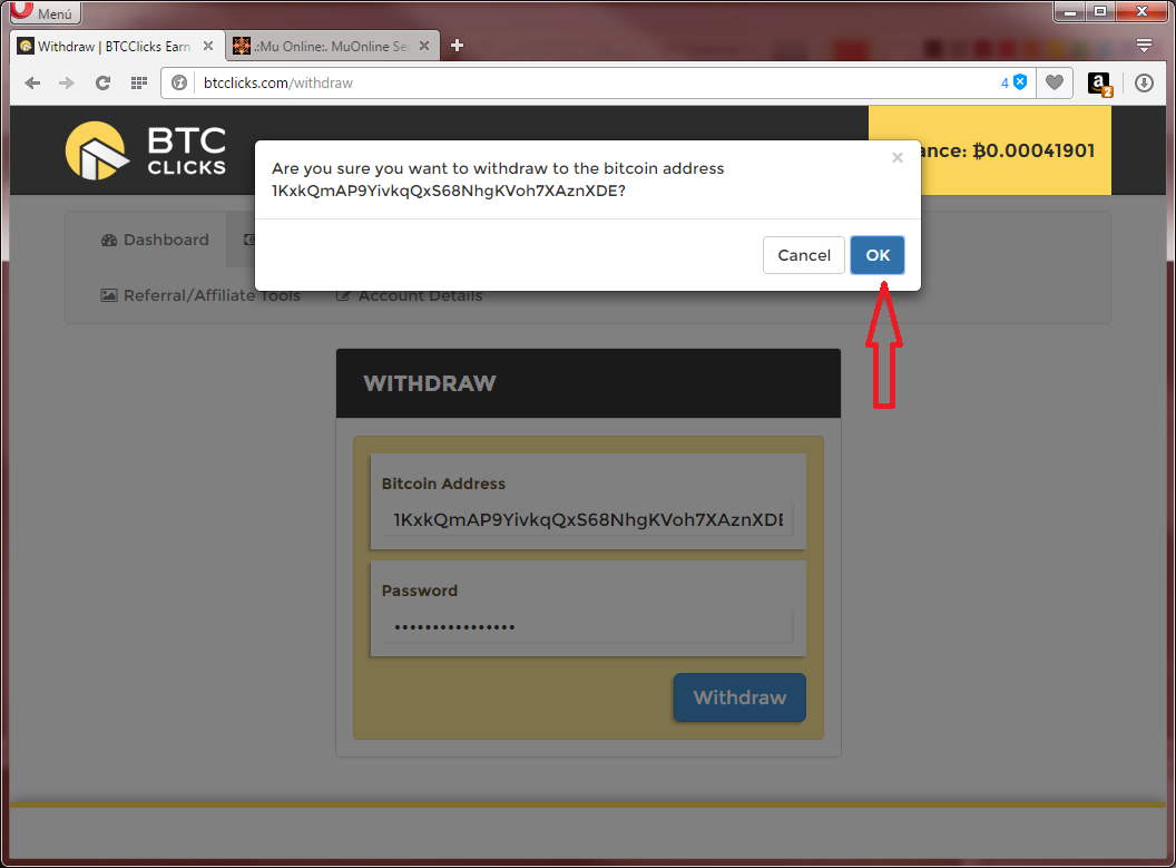 2. Escriba la dirección BTC donde indica la siguiente imagen y escriba su clave de btcclicks.com , para terminar haga click en el boton WithDraw y aprobar la transferencia.