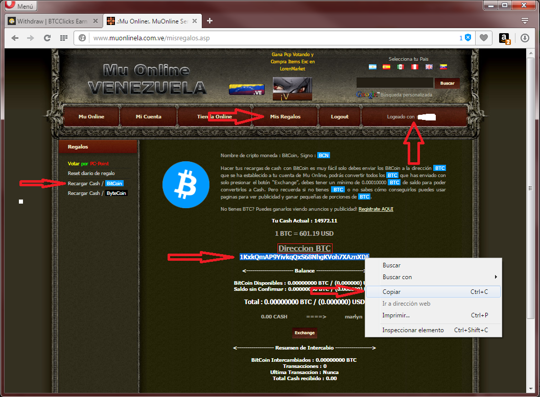 3ra parte, como cobrar tus BitCoin o enviar tu saldo a tu cuenta de Mu Online LA para convertirlo a Cash.